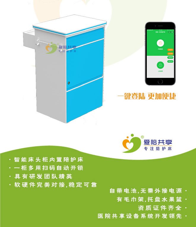 共享陪護(hù)床其實(shí)是一款共享智能設(shè)備,把陪護(hù)床和(陪護(hù)椅)床頭柜用特質(zhì)的鎖具和專門的小程序軟件聯(lián)系起來,可做床頭柜放置在醫(yī)院病房里,內(nèi)藏著一張折疊床,如果是陪護(hù)椅共享陪護(hù)床平時(shí)充當(dāng)椅子,陪護(hù)人員使用時(shí)用手機(jī)掃碼打開,就可以休息。